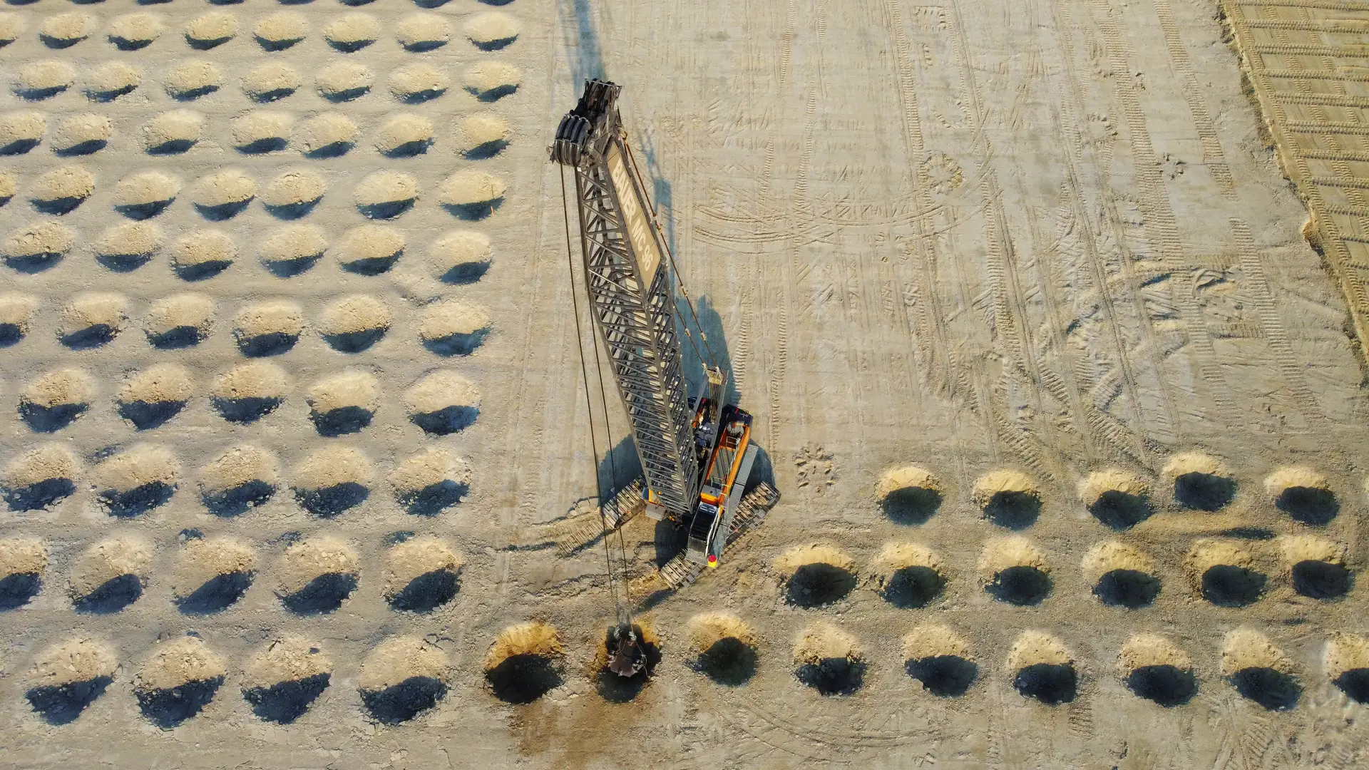 Here is how dynamic soil compaction works in practice: Steel plates weighing a total of 25 t are welded together into structures known as pounders (drop weights). A duty-cycle crane hoists them up into the air and then lets them fall to the ground in a controlled free-fall up to fifteen times, forming a crater as a result of the impact. The kinetic energy emitted on impact penetrates into deeper soil strata and leads to compaction via forced re-packing of the grains. The hoist functions of the Bauer duty-cycle crane are controlled fully automatically during these work cycles, which means that the equipment operator merely has to enter the desired target parameters into the intelligent machine controls, for example the degree of compaction and the required number of impacts for that purpose. Once the cycle has ended, the equipment moves to the next defined compaction point. This results in a grid of craters. After this initial phase, to ensure compaction over the entire area, the points between the individual craters are worked on with the pounders during the second phase. These overlapping, offset measures followed by backfilling the craters and further compaction ultimately result in a load-bearing construction surface.
